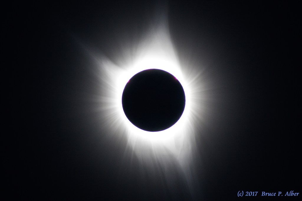 On the morning of August 21, 2017, I gather with several family and friends high on a southwest-facing slope under crystal clear skies. Slowly the sun’s intensity begins to fade, the shadows cast by nearby trees become less distinct, the chatter of the birds in those trees dies down. We fix our gaze across the valley at a long ridge about 30 miles away. Having learned that the path of totality moves across the ground at about 8 miles per second, we know that when we see that ridge go dark, it will be our turn in four seconds. And that is exactly what happens.