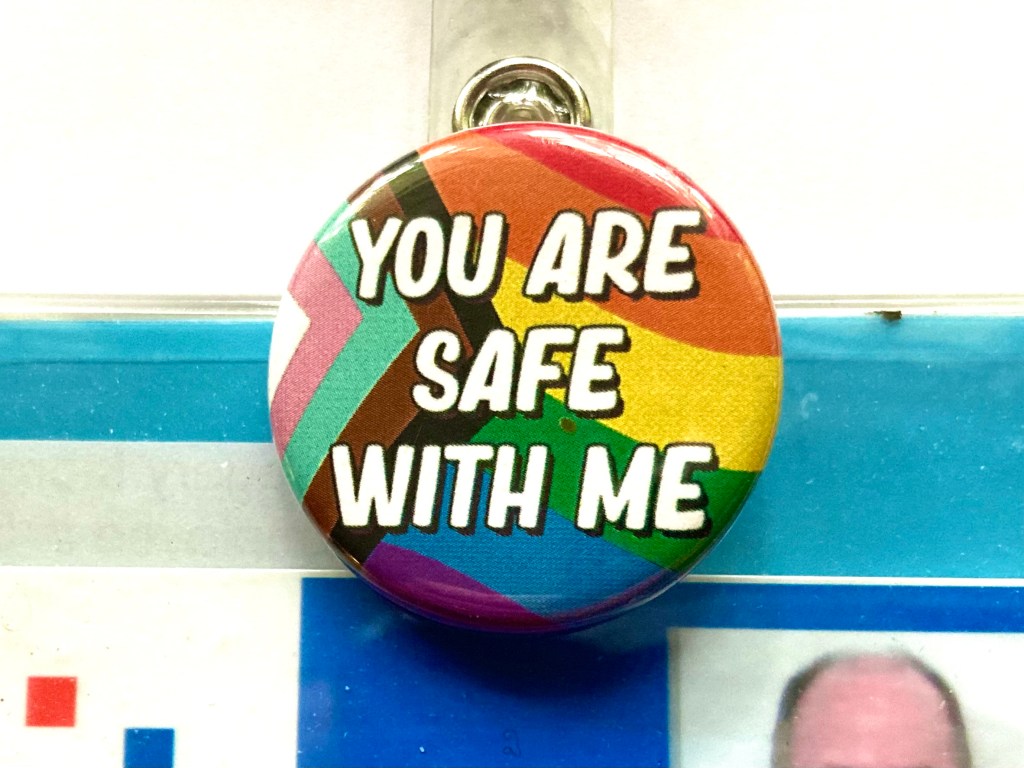 A couple of years ago, during Pride Month, someone at our hospital offered the button pictured above to anyone who wanted one. I have worn mine on my badge every day since, as “You are safe with me” is an appropriate message in any situation. Two recent patient encounters drove this home for me.